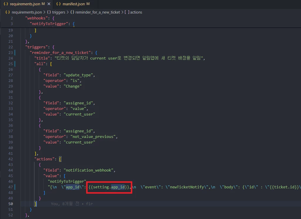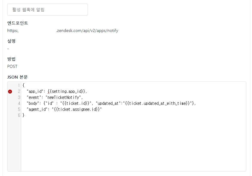 앱 요구 사항에 설치 설정 값 전달 시 트리거 액션 중 웹훅의 json body에 {{setting.parameter}} 지시어 사용은 안되나요?