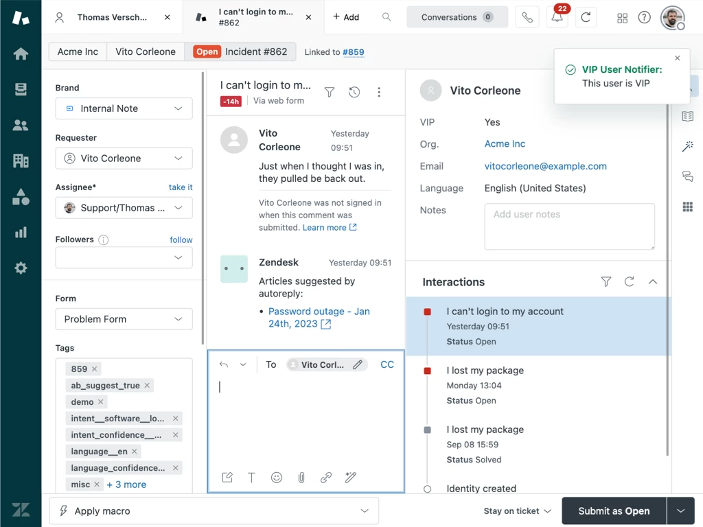 We have a need that I can't imagine is unique to us: We need our agents to be able to quickly identify that an incoming ticket is from a VIP customer. Tagging the VIP orgnizations is an easy thing to do but we need that to be in "flashing letters and sirens" (exaggeration intended) for our agents to see on the ticket. I can imagine this happening in a number of the ways I'll list below but I'm open to whatever might be available: