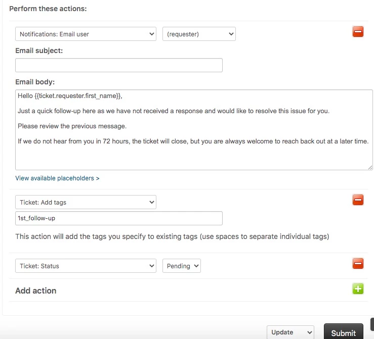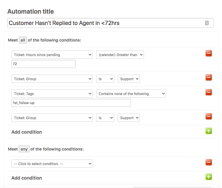 I'm trying to create another automation for when the customer still has not replied, even with this initial follow-up message above. However, I'm not sure what conditions will need to be met for another automation to send a second (final) follow-up response letting the customer know that we are Solving/closing the ticket due to no response. This would be for when we've sent this (above) follow-up message, and another 72hrs have passed since the time that the automation above was sent.