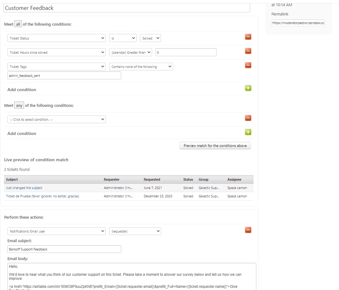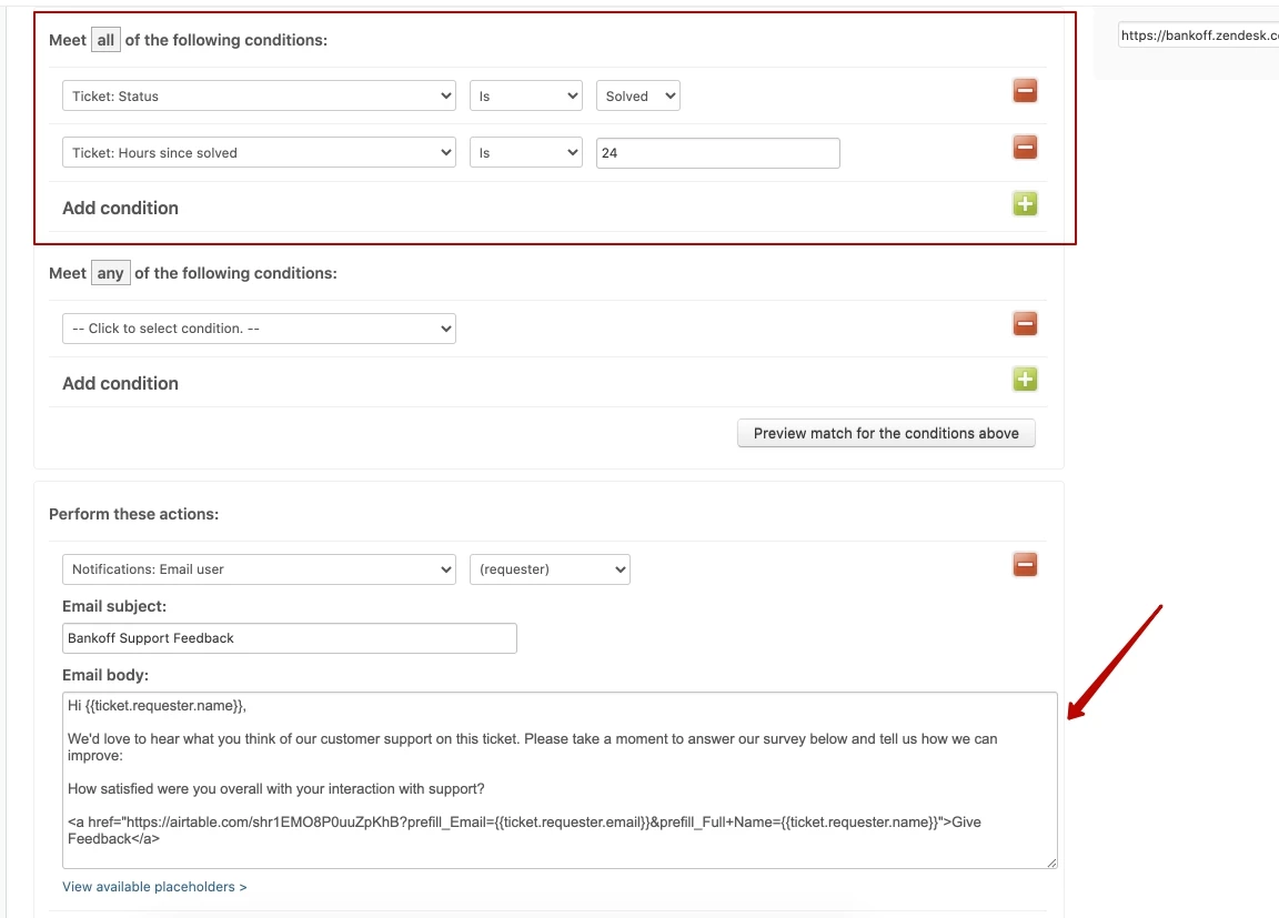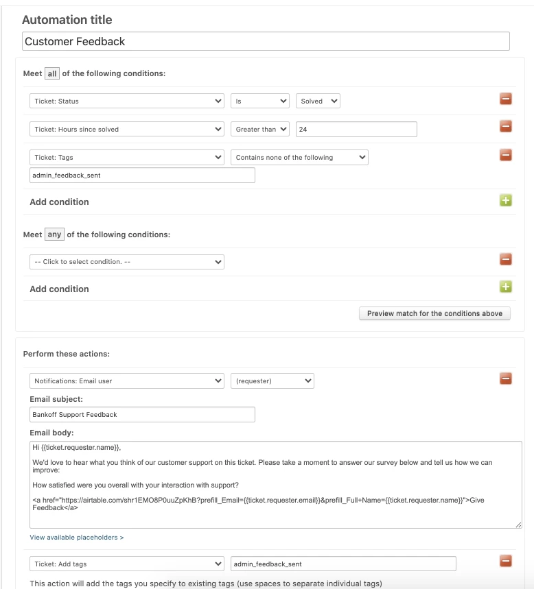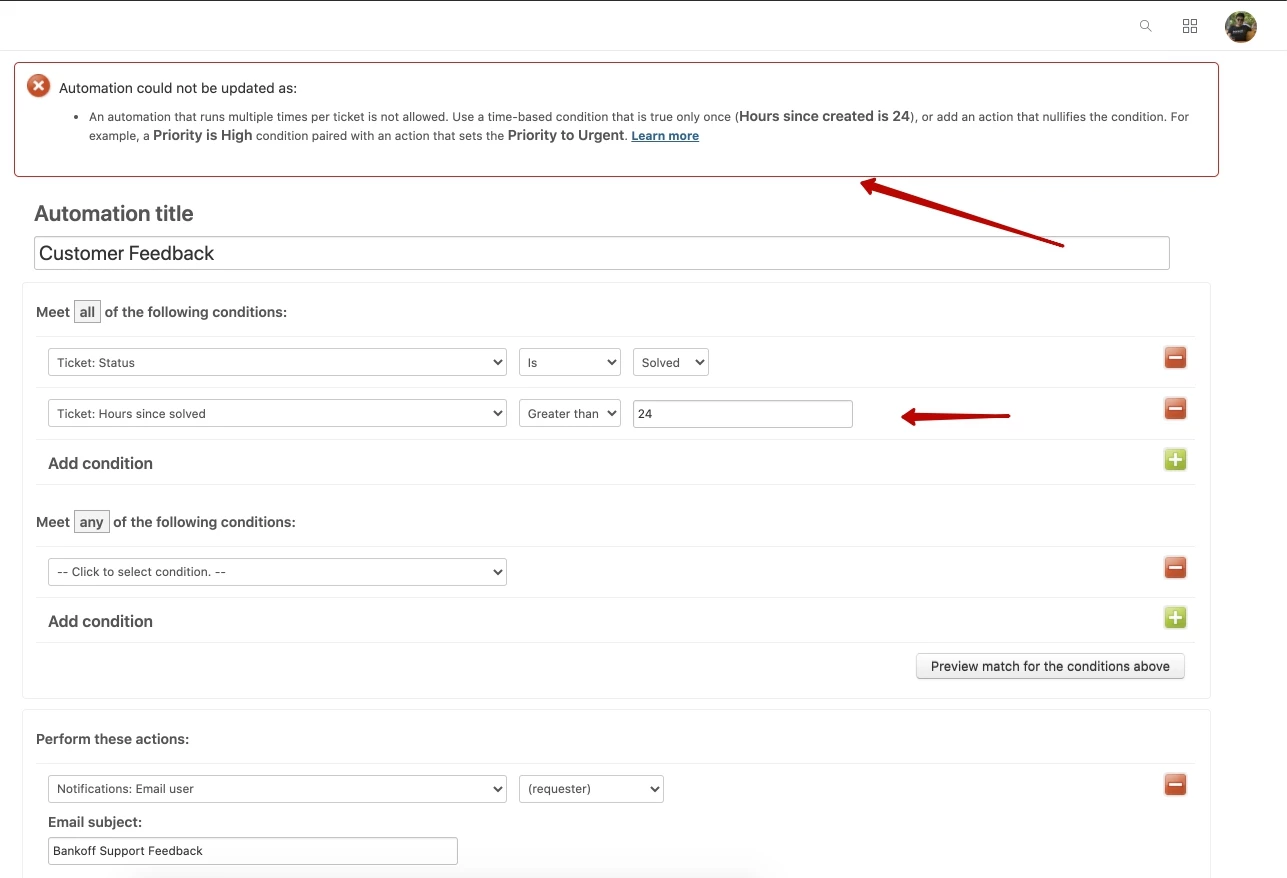 Hi there. I added automation to get feedback from the customers whose ticket is solved and the Hours since solved is 24. Unfortunately, automation has not sent any emails to the customers. The email is: