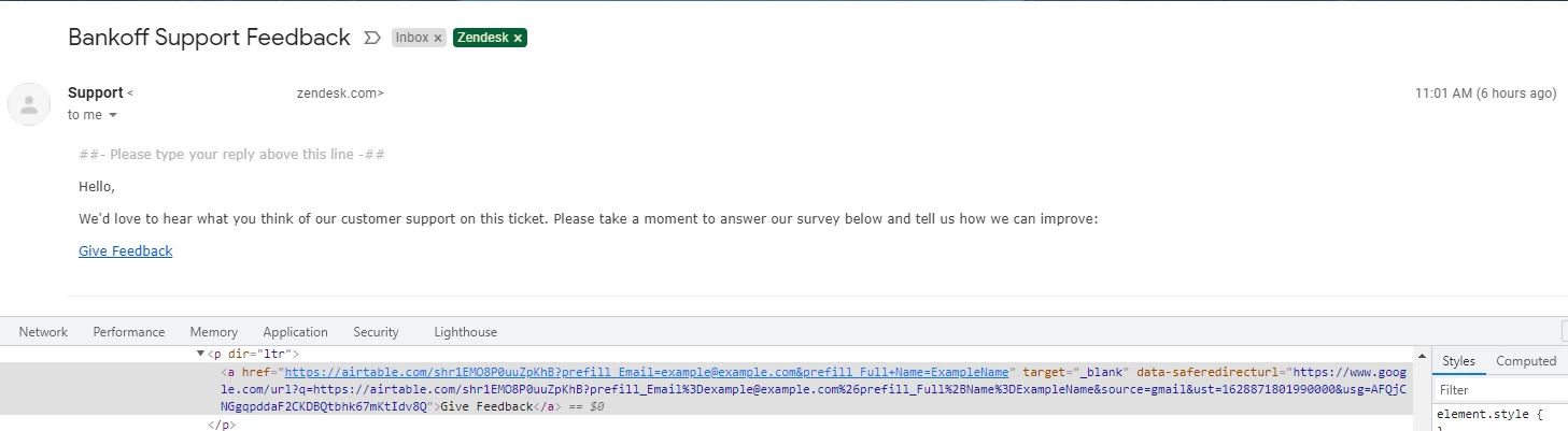 <a href="https://airtable.com/shr1EMO8P0uuZpKhB?prefill_Email={{ticket.requester.email}}&prefill_Full+Name={{ticket.requester.name}}">Give Feedback</a>
