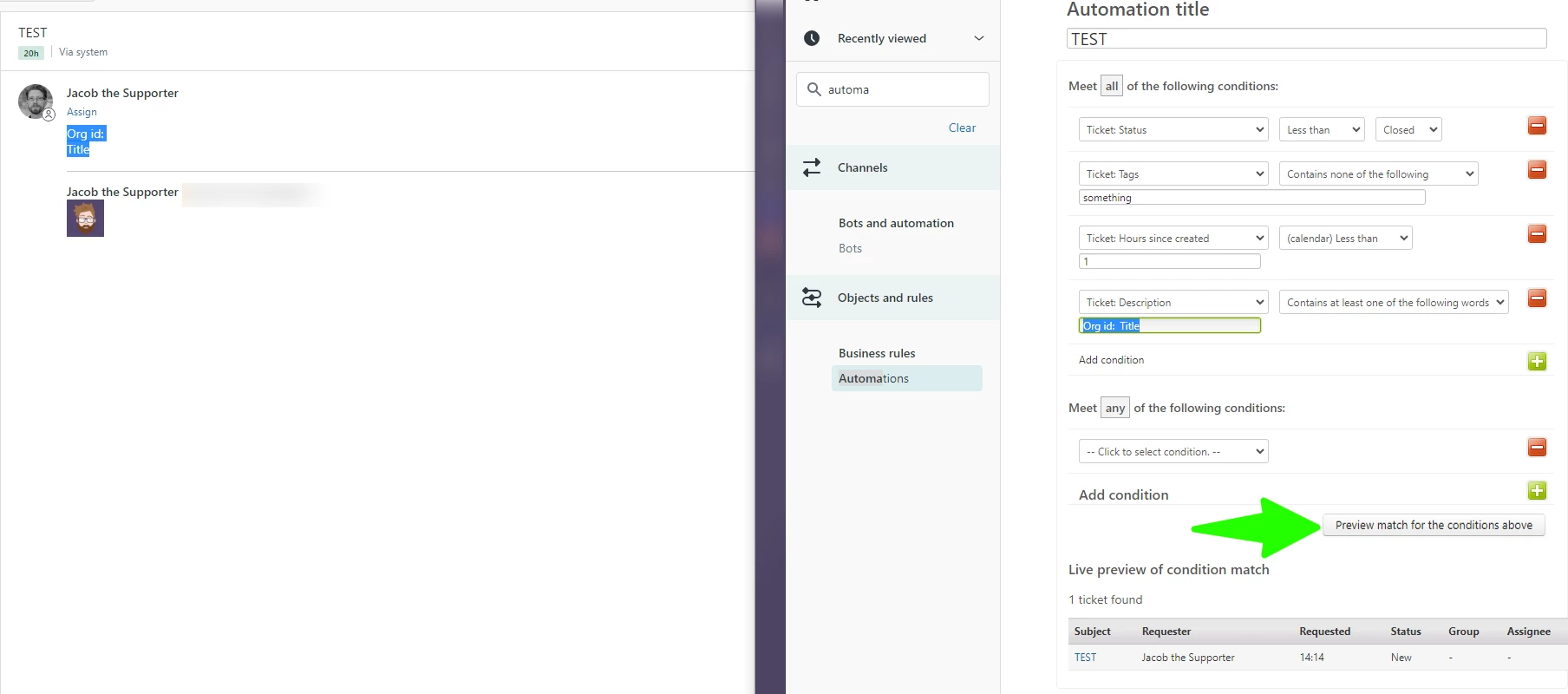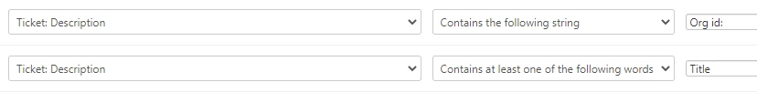 but it isn't picking up any tickets as a condition match. If I just put "Org Id: " It picks up tickets but I need it to be specifically followed by Title on the new line. Any ideas on how to set this up?