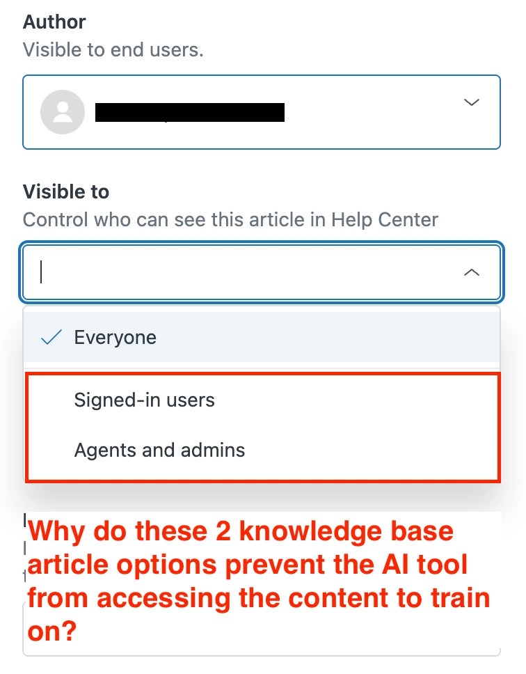 Generative responses come from help center articles that are publicly available. Articles that require a login or have restricted access are more difficult for the AI agent to find and use when providing suggestions. This helps the AI give answers based on information everyone can access.