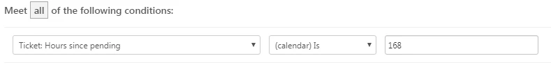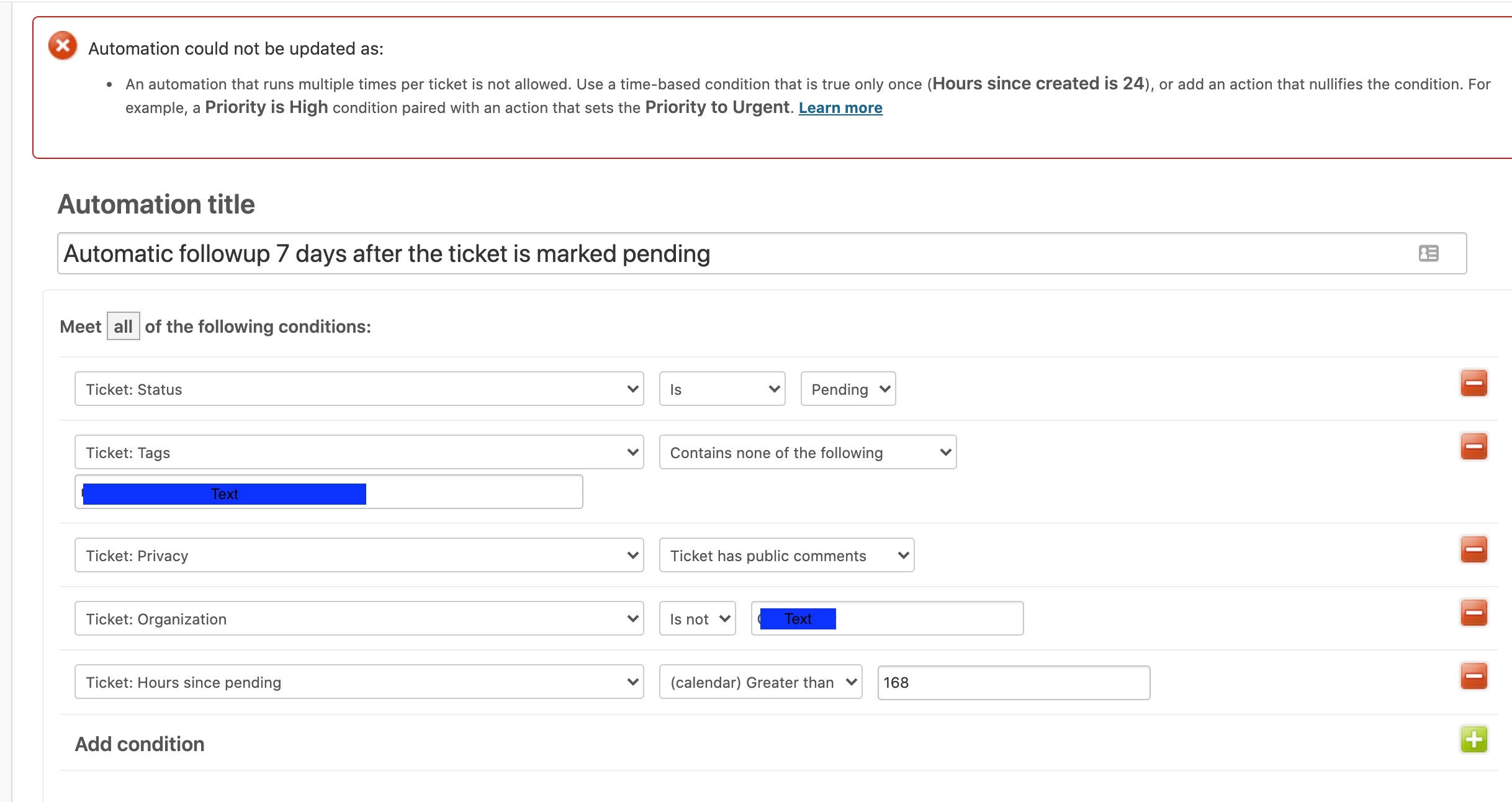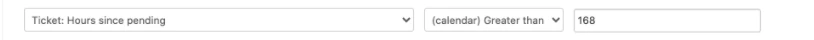 I am creating an automation to fire after a week and it throws this error even though I set the ticket hours since pending is 168. `Automation could not be updated as: