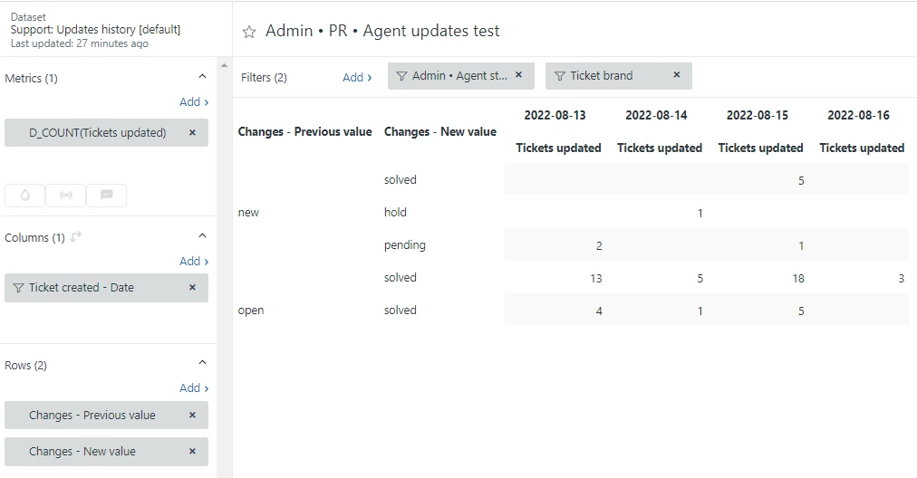 I'm having some trouble trying to find out how many tickets each of my agents handles per day (solved + pending + on hold). I can find # of solved tickets per day but I really want to account for all tickets they handle daily. Im hoping someone here can help me as I haven't found a solution through support.