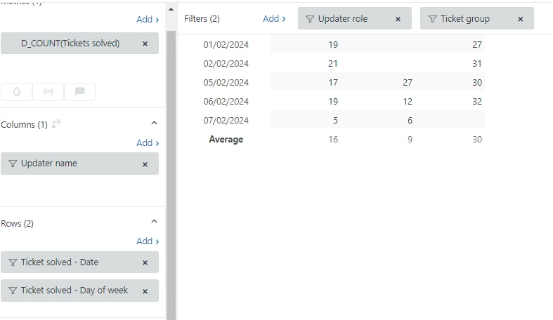 I want the average number of tickets solved by the agent report shown by day, excluding weekends, and the average number of tickets solved monthly.