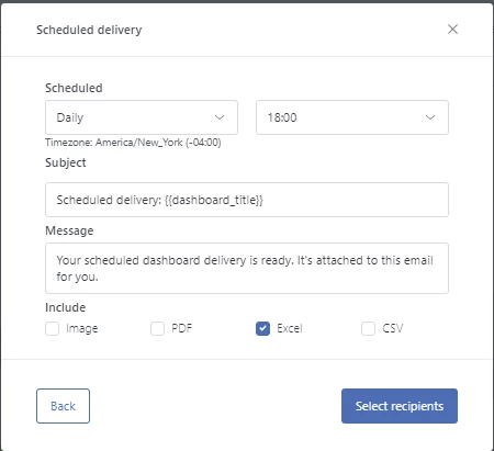 Is it possible to select the time filter different than default (one month filter) for scheduled reports. Also, is it possible to configure the content of the reports if the xls or csv is selected as reporting format.