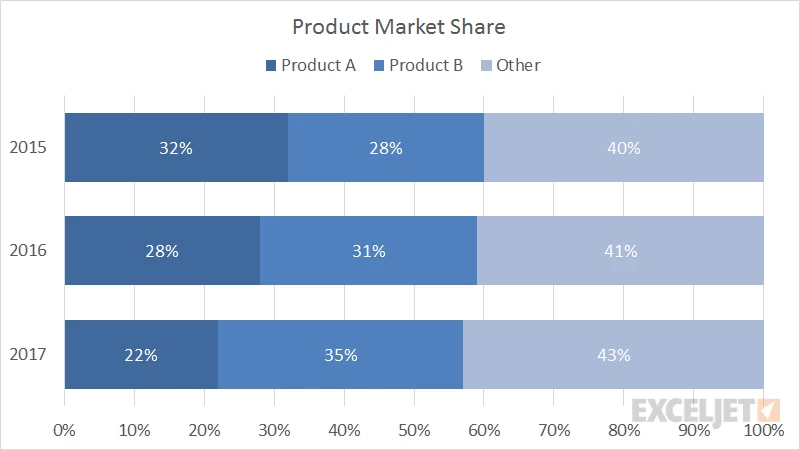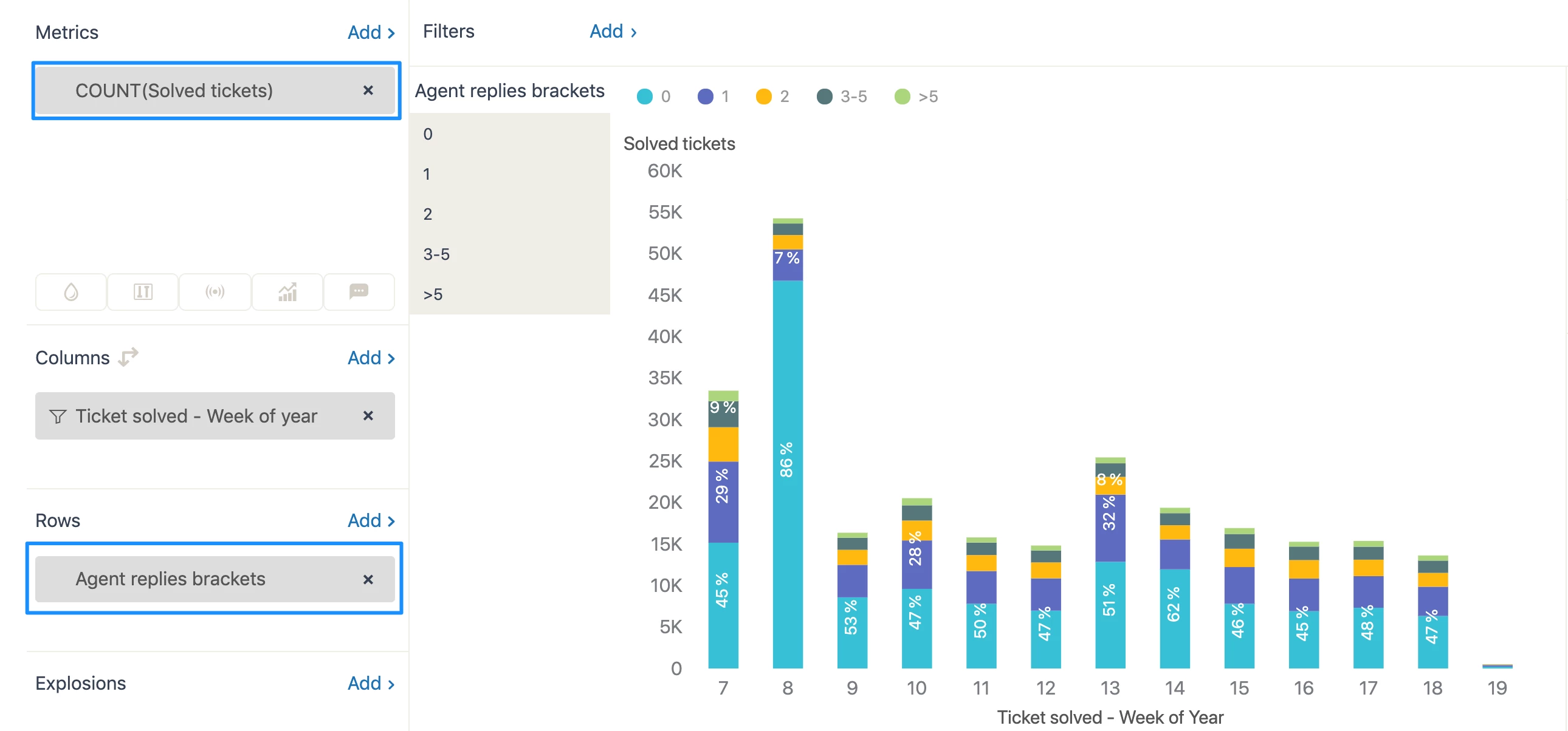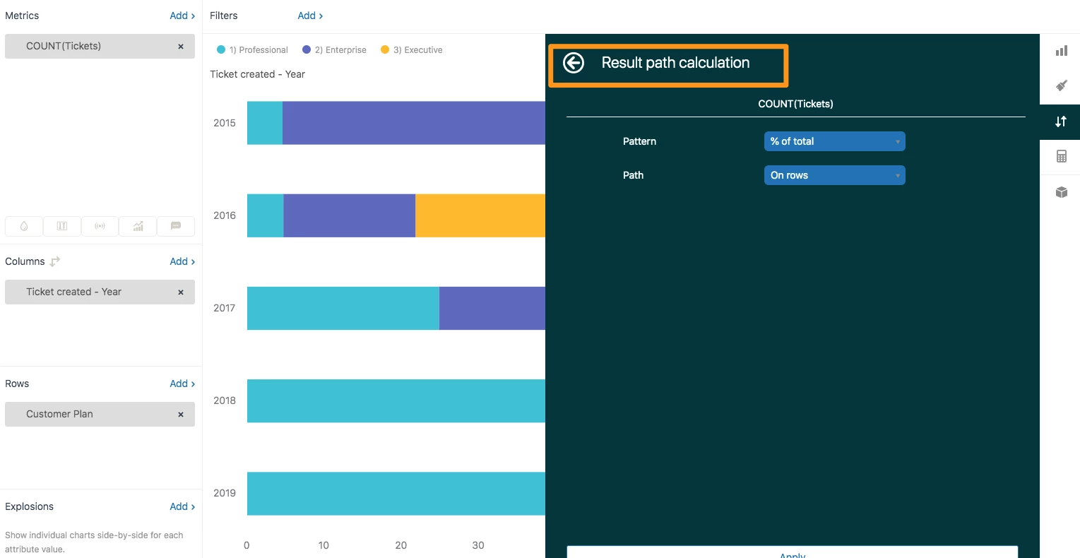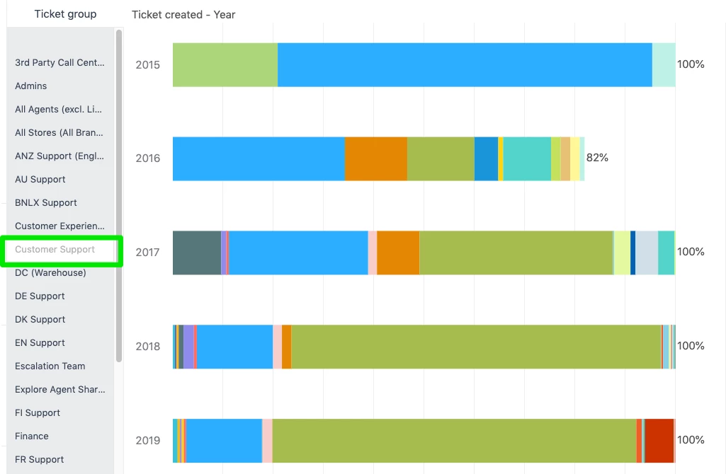 I'm trying to set up a stacked bar chart where every column/row adds up to 100%, in order to visualize proportions. I want to compare the percentage of tickets we get by Product Module (custom field of ours). However, I can't find any options to do so, neither in x-axis nor y-axis options in the Chart Configuration sidebar. See below for an example.