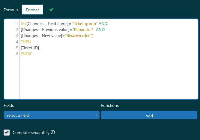 I am trying to create a custom metric with the Ticket ID for tickets in which the ticket group changed from "Reparatur" to "Beschwerden". This is what I got so far: