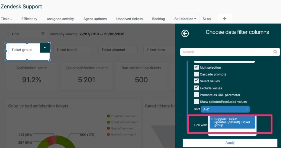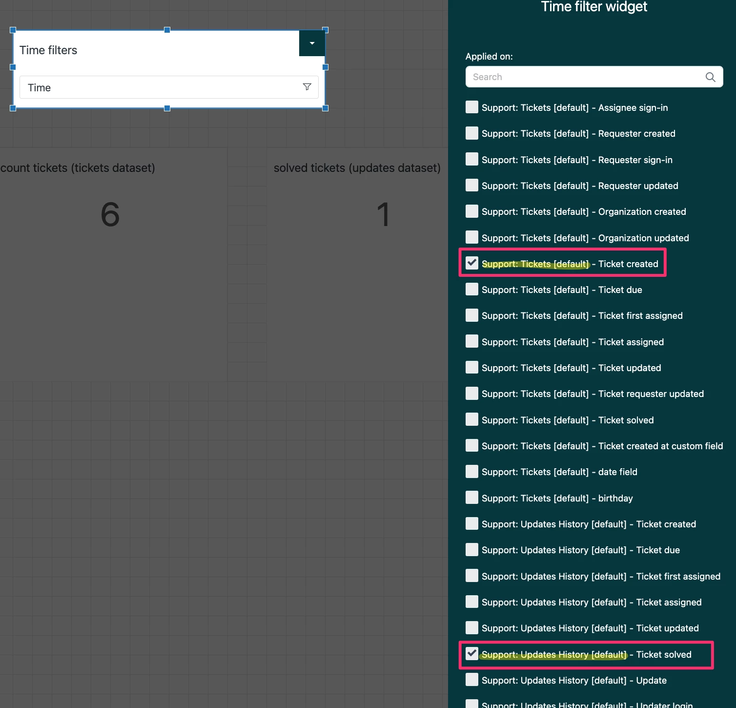 I want the agents to filter the dashboard by their name and date and get relevant results. The problem is that there is no filter that will affect the two different datasets. I will need to add a pair of filters for each report.