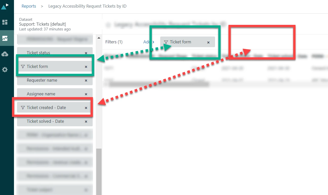 In the picture below, you can see that the form filter has been applied, and that it displays at the top and on the left. However, the created date appears to be filtered based on the left, but is not displayed on the top: