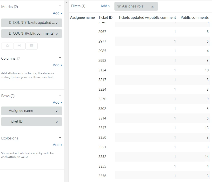 We would like to know the number of solved tickets have more than two public comments by agent in Zendesk Explore, but not sure how to set this report up.