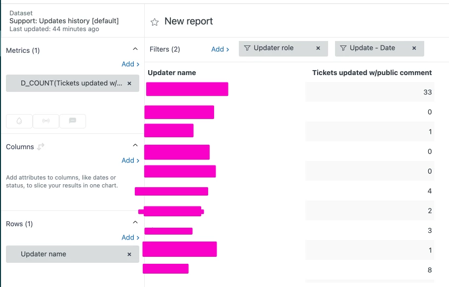 I know we can use the Update History dataset to count the number of total public comments per agent on a given day, but how can I build a report that only counts one public comment per ticket? Any advice is greatly appreciated!