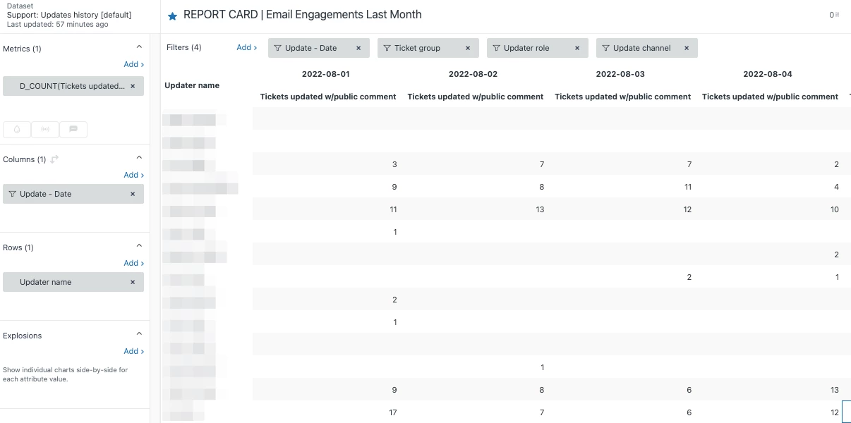 In the chat dataset, there's a great metric of 'engagements' which essentially shows the number of customers an agent spoke to (on chat) in a day. We feel this is a fairer metric overall than ticket solves since more than one agent can touch a ticket (or to put it another way, multiple agents can 'engage' with a customer on a single ticket). However, there isn't really an equivalent metric that I'm aware of for email interactions. The closest I can think of is the number of tickets with a public comment on a given day for each agent, but I'm not sure how to build such a report.