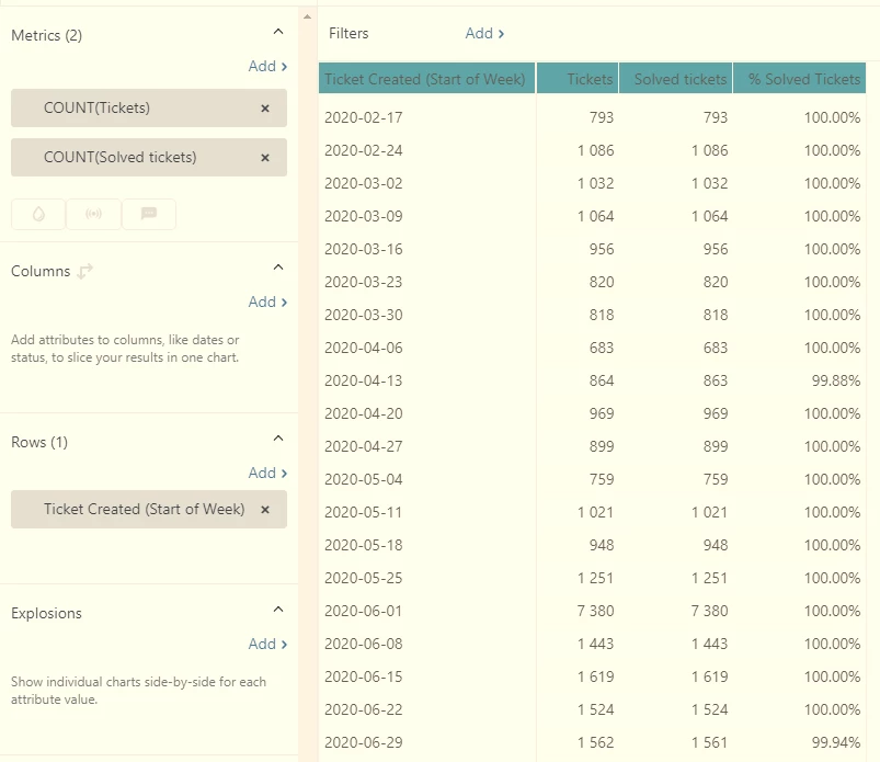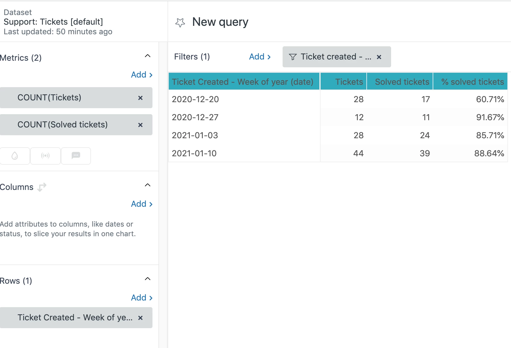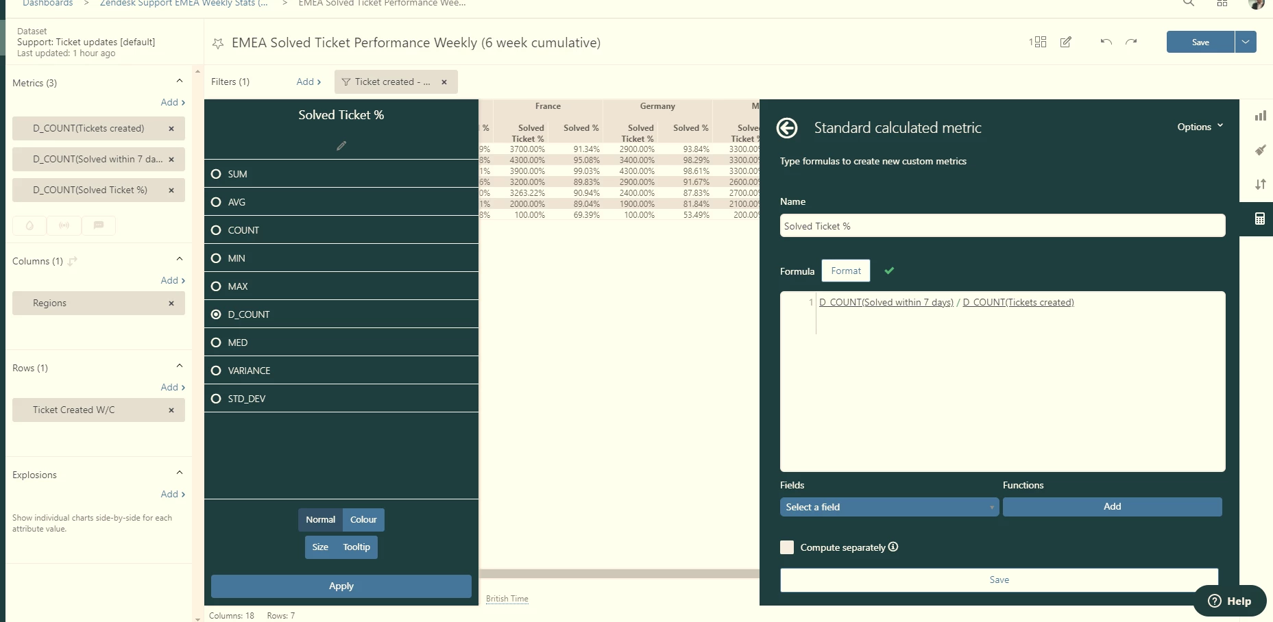 Hi, I'm looking to create a metric for solved ticket performance, I want to be able to display the percentage of tickets which were solved within 1 week, in any given week, e.g. in a given week, if I had 10 tickets created and solved 9, therefore leaving 1 still unsolved, I want to report 90% success rate.