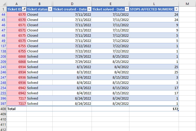 I cannot figure out how to create a report that will show the sum of a custom number field metric and only add tickets once not multiple time. The reports keep summing the same ticket ID multiple times so my sum is not accurate! In the photo - my calculated metric i am using to SUM is the last column - stops affected.