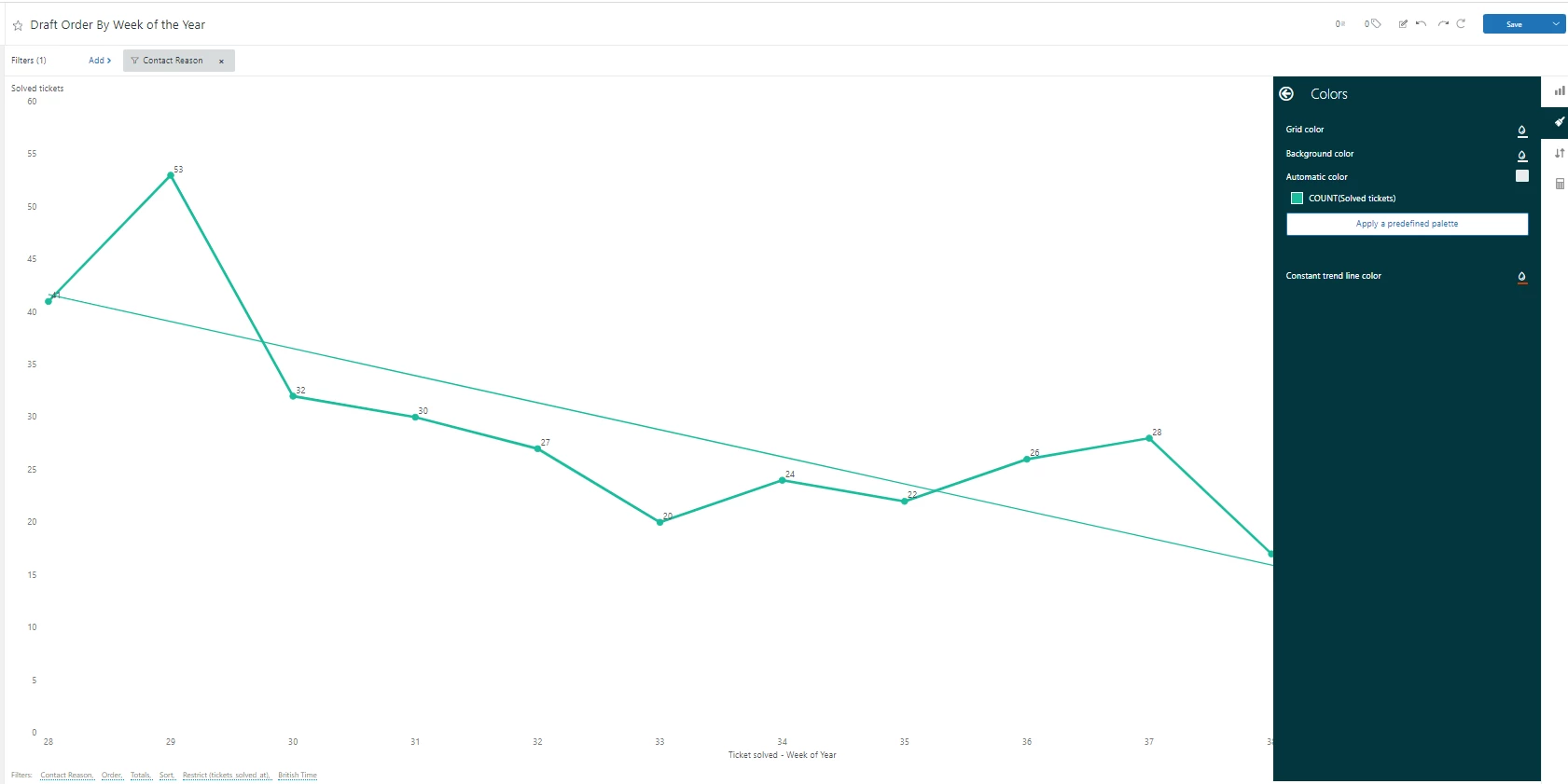 I would like my trend line to be a different colour from my chart, however, when I change the trend line colour, nothing happens. And changing the colour of the chart changes the colour of both the chart and the trend line. In the screenshot you can see the colour I've chosen for the trend line is red, but it is not updating.