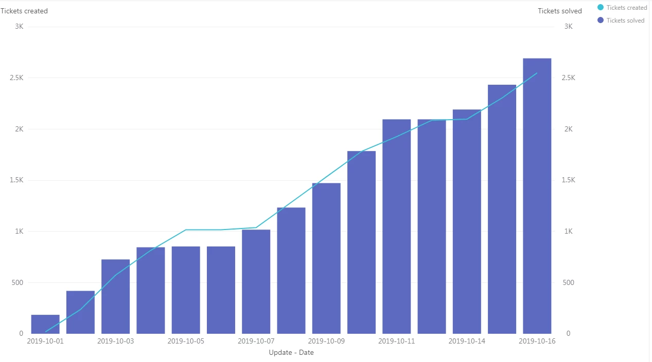 Hi there! I need to have a report in which I can see the total volume of tickets by status on a given day. So, if I have 20 new tickets per day and all of them are being solved, I would have:
