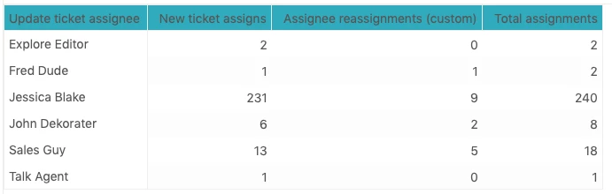 This report returns the number of times your agents were assigned to a ticket, even if they are no longer the assignee on the ticket.