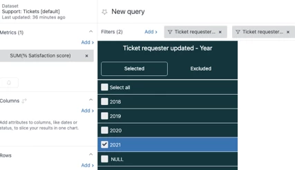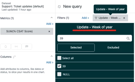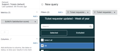 What I am trying to do is create a query similar to the "% Satisfaction score (Today) calculated metric. However, I would like to retrieve the satisfaction-scored tickets within a specific time period. Generally the week prior, so in week 40, I would like to pull all of the tickets which received a satisfaction reply from week 39.