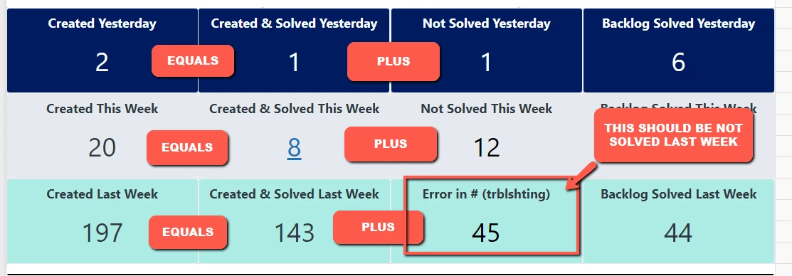 I am new to Zendesk reporting and dashboards. I have a request to make the math work. Basically they want the Tickets solved (time period) + Tickets unsolved (time period) = Tickets Created (time period). As you can see in the screenshot, the time periods of 'Yesterday' and 'This Week' work as expected. The issue is 'Not Solved' last week. If the ticket created 'last week' is solved on Sunday or Monday then it is not counted in the 'not solved last week' count.