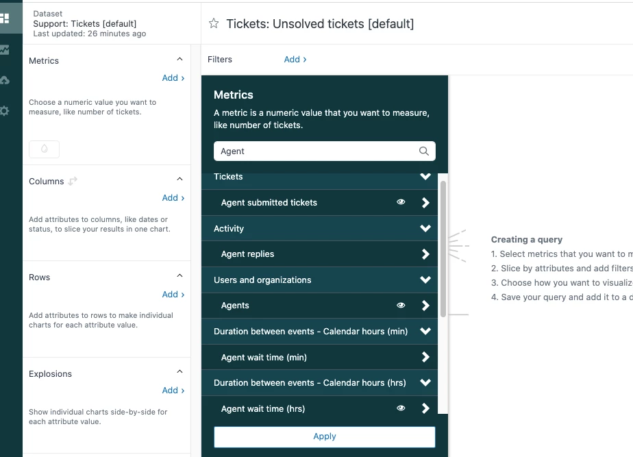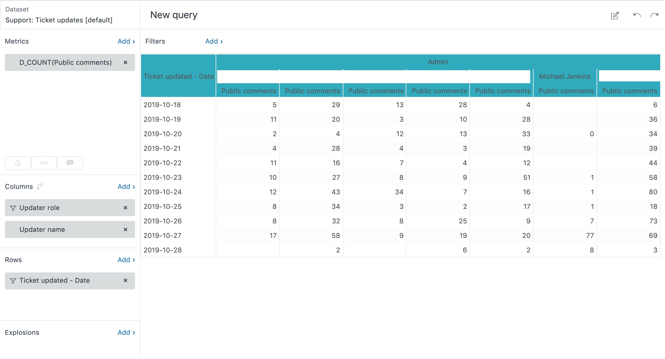 I've asked Zendesk support directly and they tried to help but said they could not give me a recipe to do this - does anyone have a recipe that will show me how many tickets my agents touch PER DAY in explore? I can only find this for Insights.
