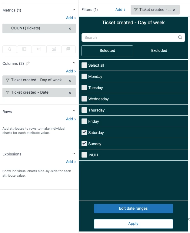 Objective: Build a report to see the total number of new tickets being created during Saturday and Sunday only.