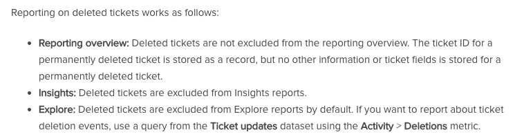 Can someone confirm if we delete a ticket from the main queue, will the numbers in the reporting be affected? Or the report will still show the original number of the tickets created?