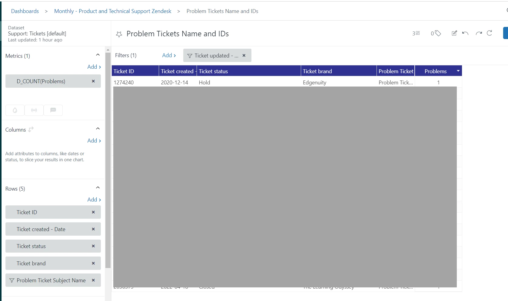 - If Chart A is filtered to only show a subset of problem tickets (as we filter out each by the ENG/Product team responsible), then Chart B needs to be manually filtered on Ticket Problem ID to match what's returned in Chart A (I'm aware we could probably get around this manually filtering with additional ticket fields, etc. but that is not an elegant solution and I would prefer not to follow along)