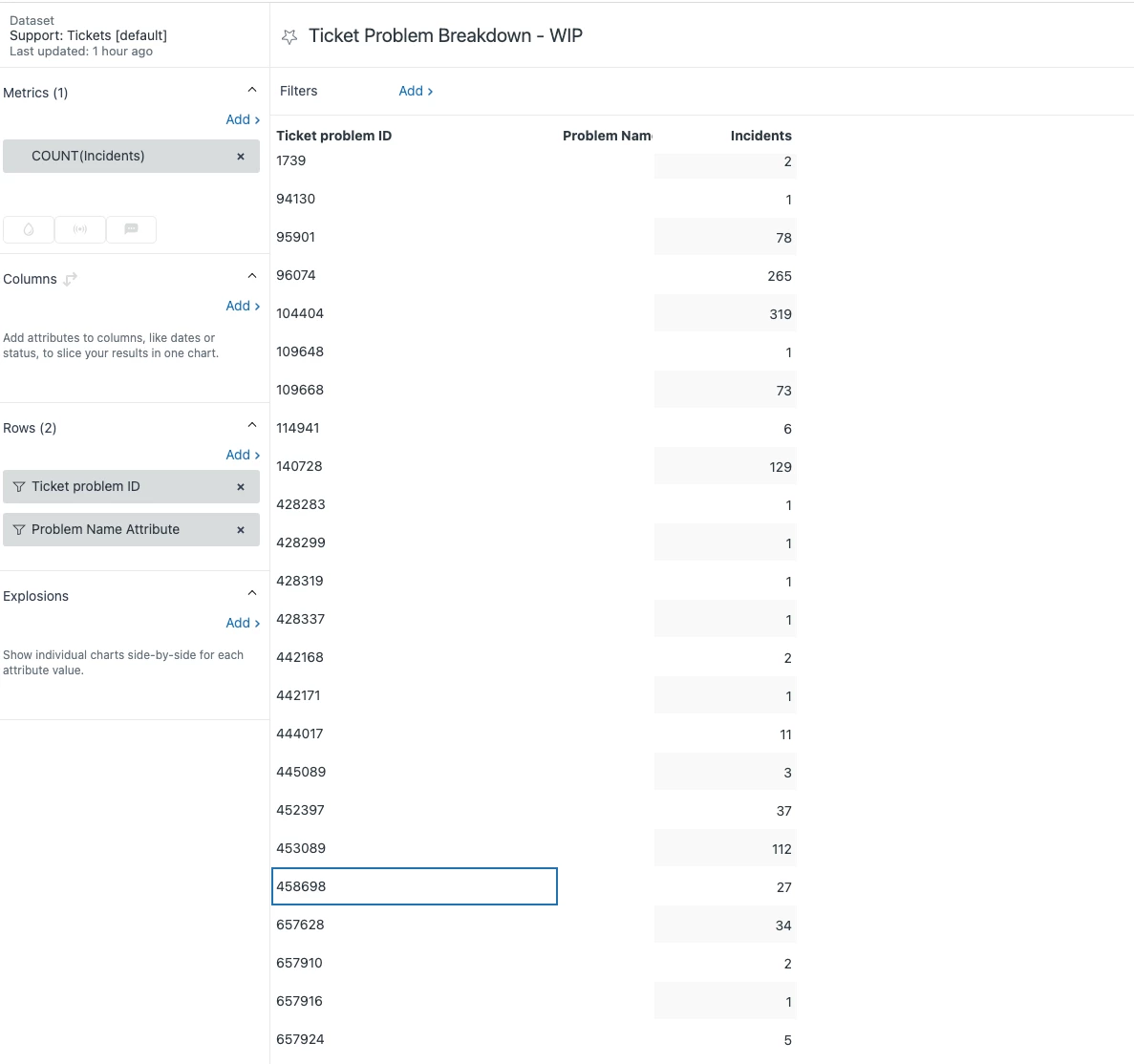 - We are hoping to create a single report which displays the Problem Ticket Subject along with it's incident counts (so essentially it would be a table with columns Problem Ticket ID, Problem Subject, # Incidents)