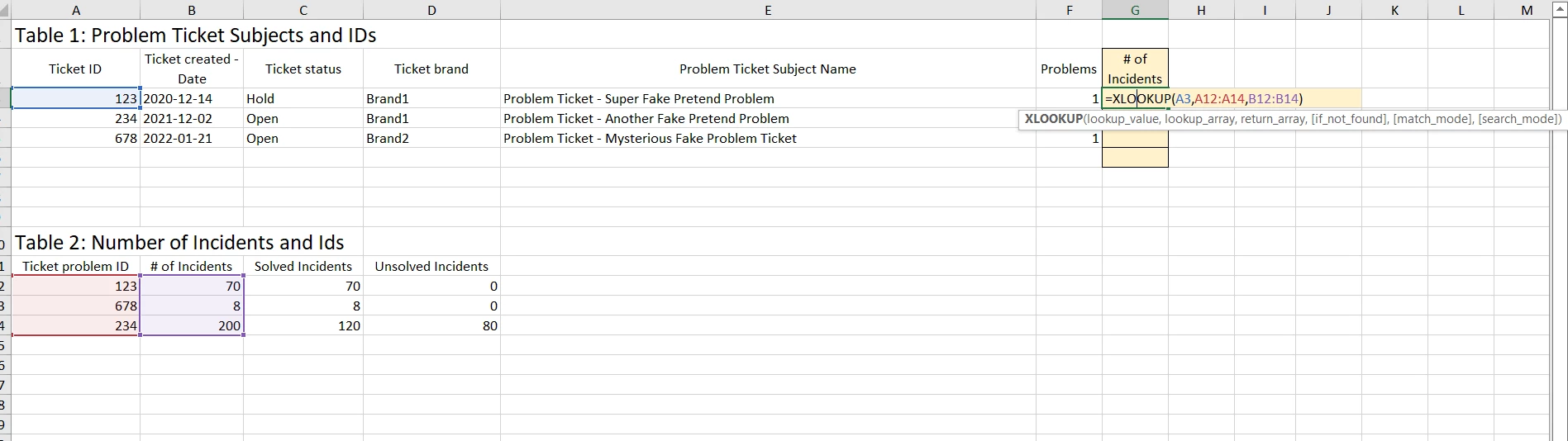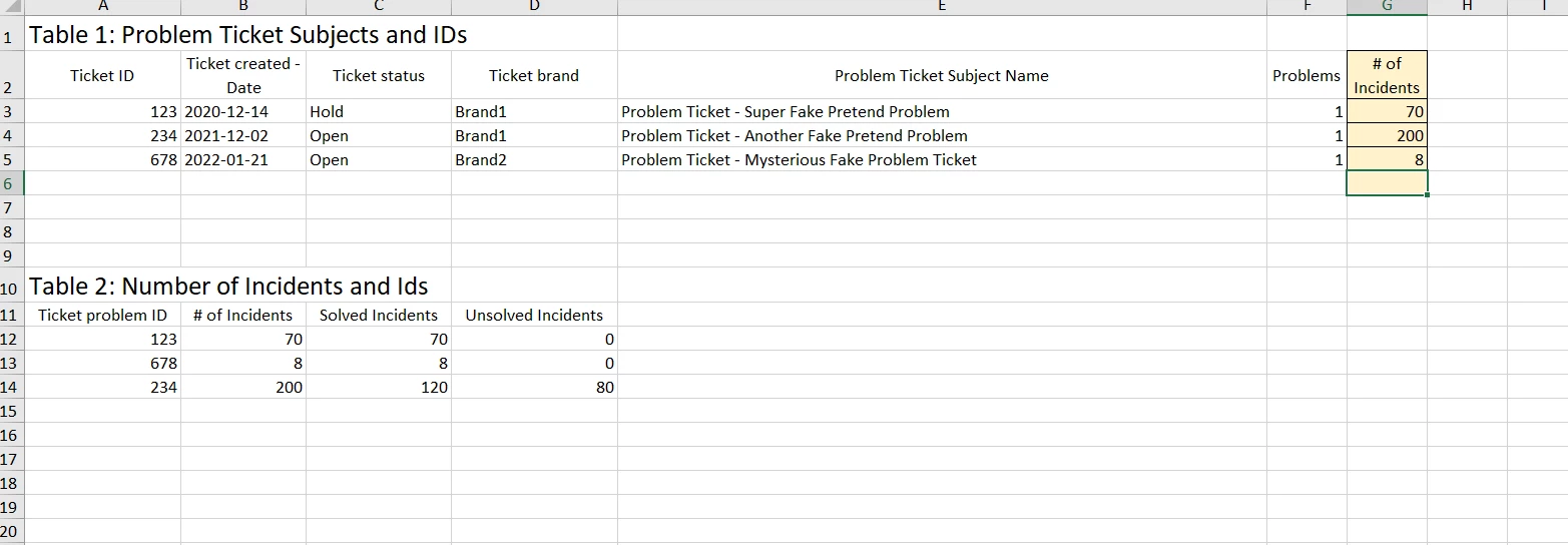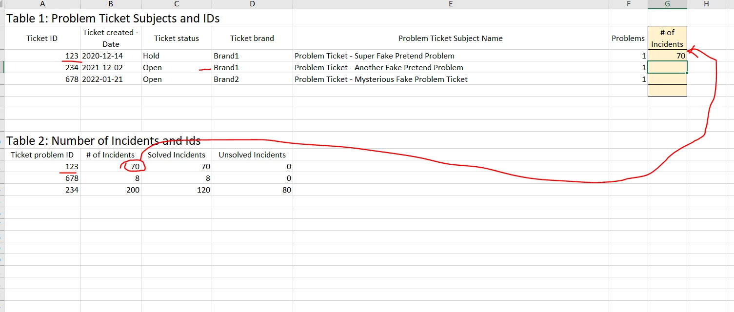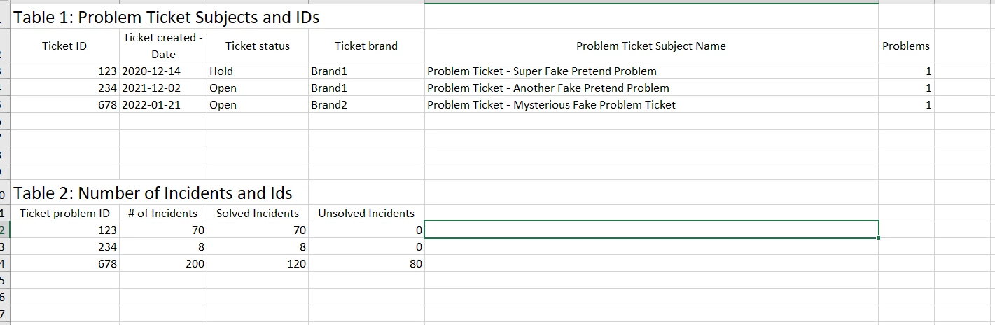 - We're currently limited that we can get one table with Problem Ticket ID and Subject (call this chart A), and a second table that shows Problem Ticket ID & # Incidents (call this Chart B)