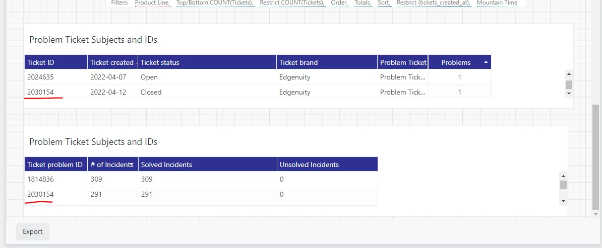The first image is of the two tables in Zendesk Explore I created. I underlined how Problem Ticket ID and Ticket ID were returning the same values. And I can confirm if you look up that ticket number in support those incident counts from the second table and the subject line from the first table do in fact match.