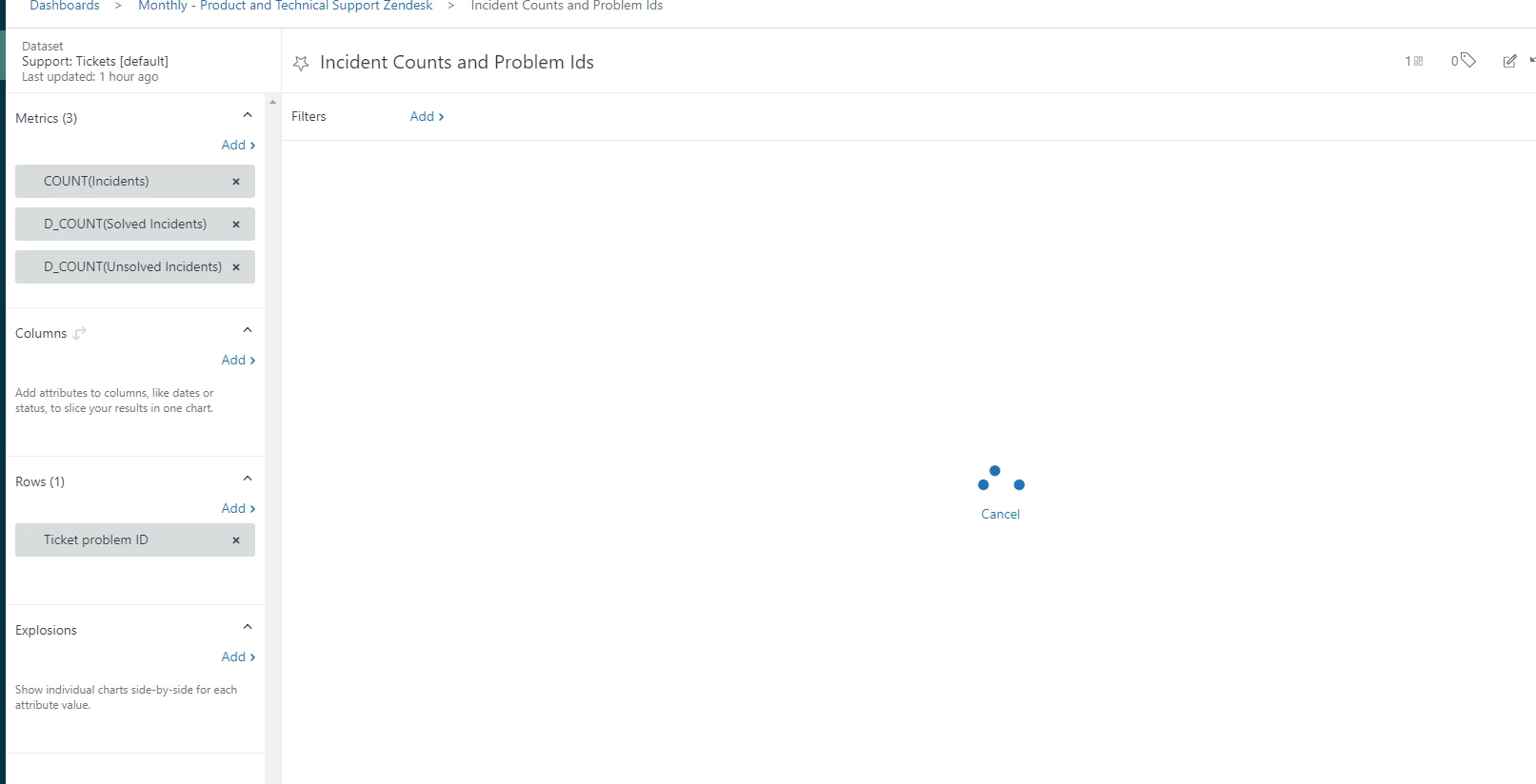 What I need is a means for Explore to connect Problem Ticket Subjects w/ Incident counts - pretty basic, and I shouldn't have to go through a million steps to get a report that accurately updates how many incidents are linked to a Problem ticket w/ its subject. I can think of other manual ways to capture this (heck, I can add a numeric field and make my agents update the problem to +1 the vlaue in that field every time a new incident is added, but this again is not ideal, people will get busy and forget, and it shouldn't be the workaround given that Zendesk clearly knows how many incidents there are, just they don't surface that anywhere as an attribute of the Problem ticket for reporting purposes)