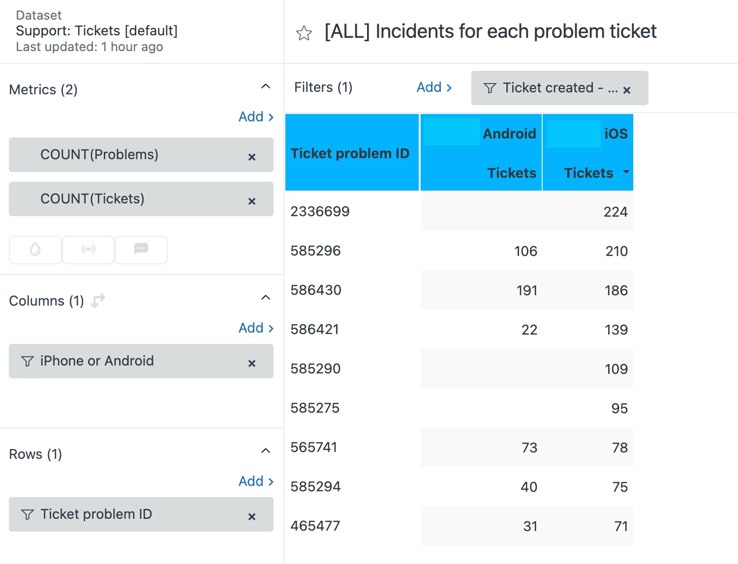 I created a report where I have a list of all of our Problem Tickets, and for each of them, the number of incidents for Android users and for iOS users of our app.