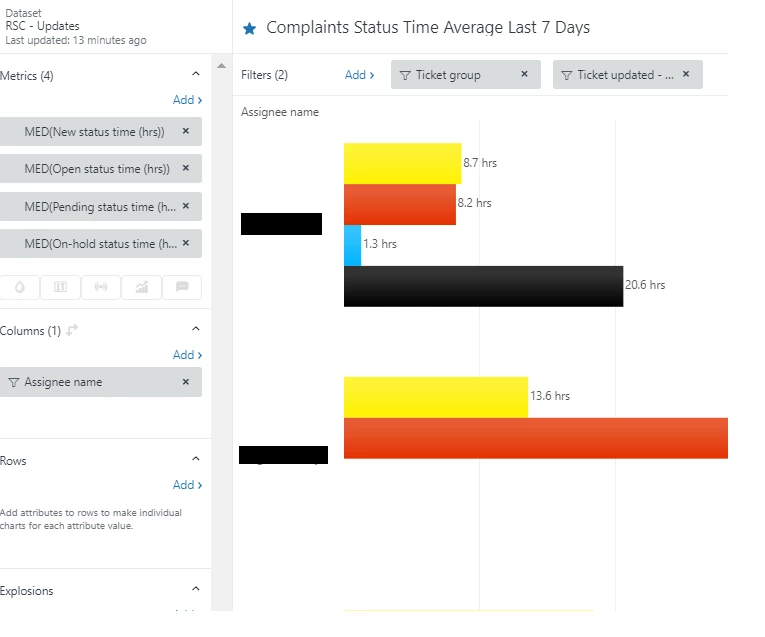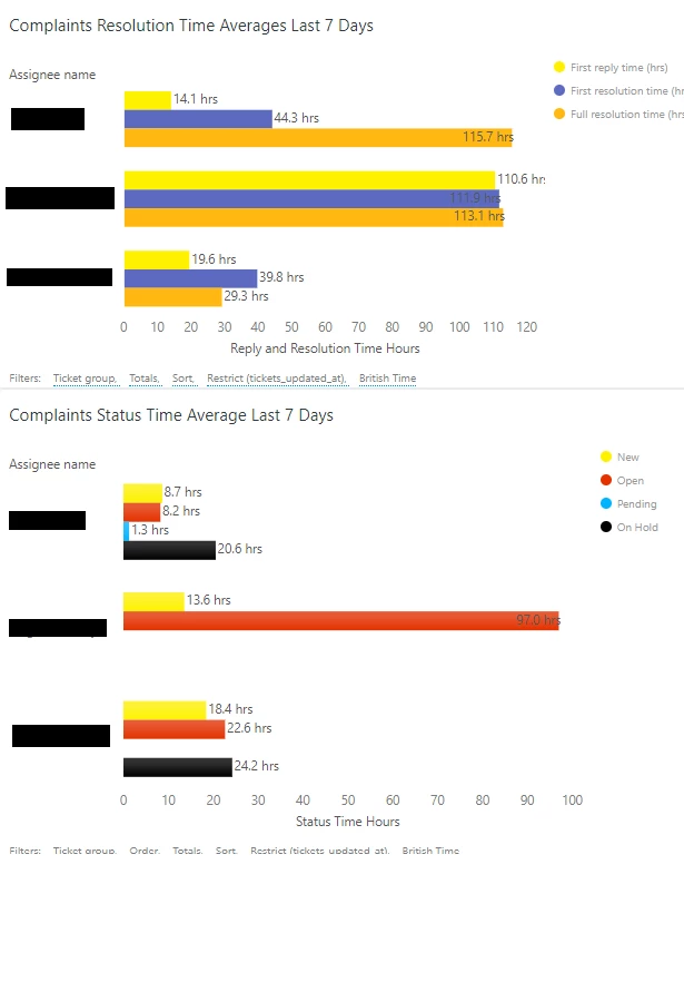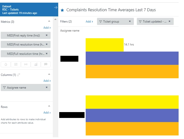 I've checked the queries and both of them are calculating by median, concern the same assignees, the same ticket group, and the same time period (7 days prior to today). These are the queries being used: