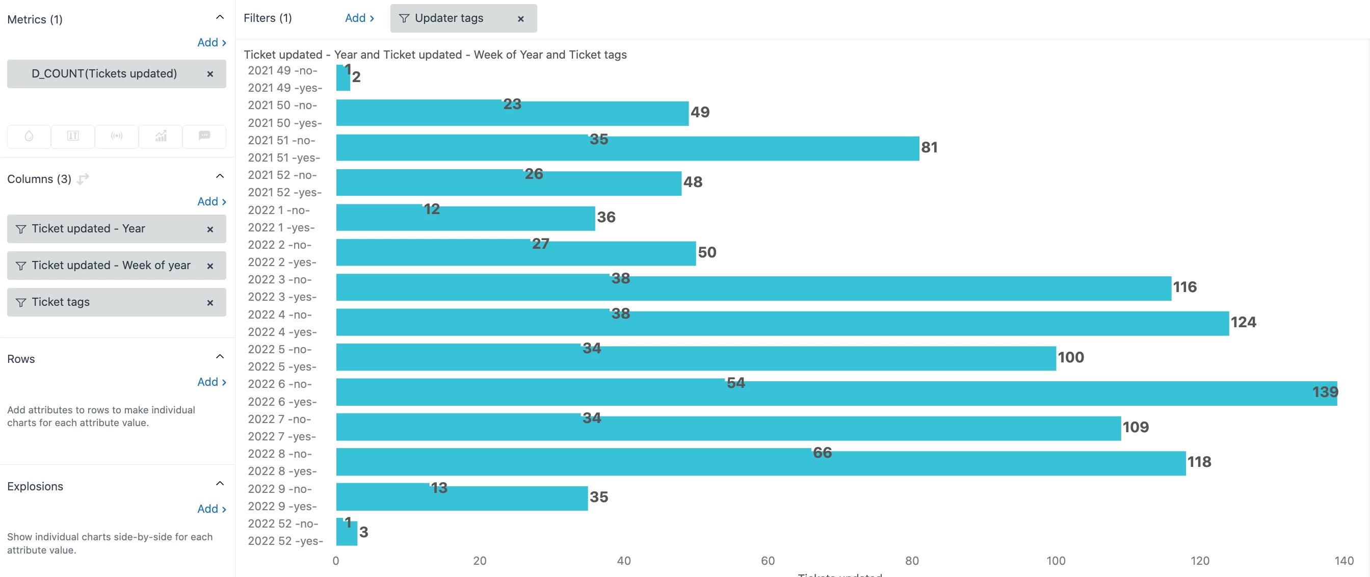 I'm trying to create a stacked chart between 2 ticket tags that we record each week, a simple Yes/No Tag.
