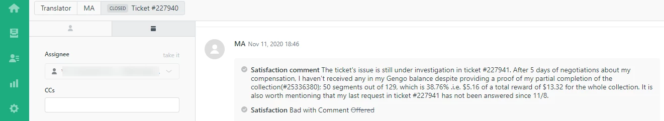 Hello, I created a ticket a while ago, but the agent in charge did not read or did not understand what I was saying. I have heard nothing back from him for almost 2 months. I created a follow-up ticket, which was closed with no answer whatsoever. This doesn’t sound like the kind of support that a company like Zendesk should be offering, and I’m very dissatisfied (not just “unsatisfied”).