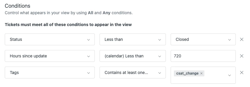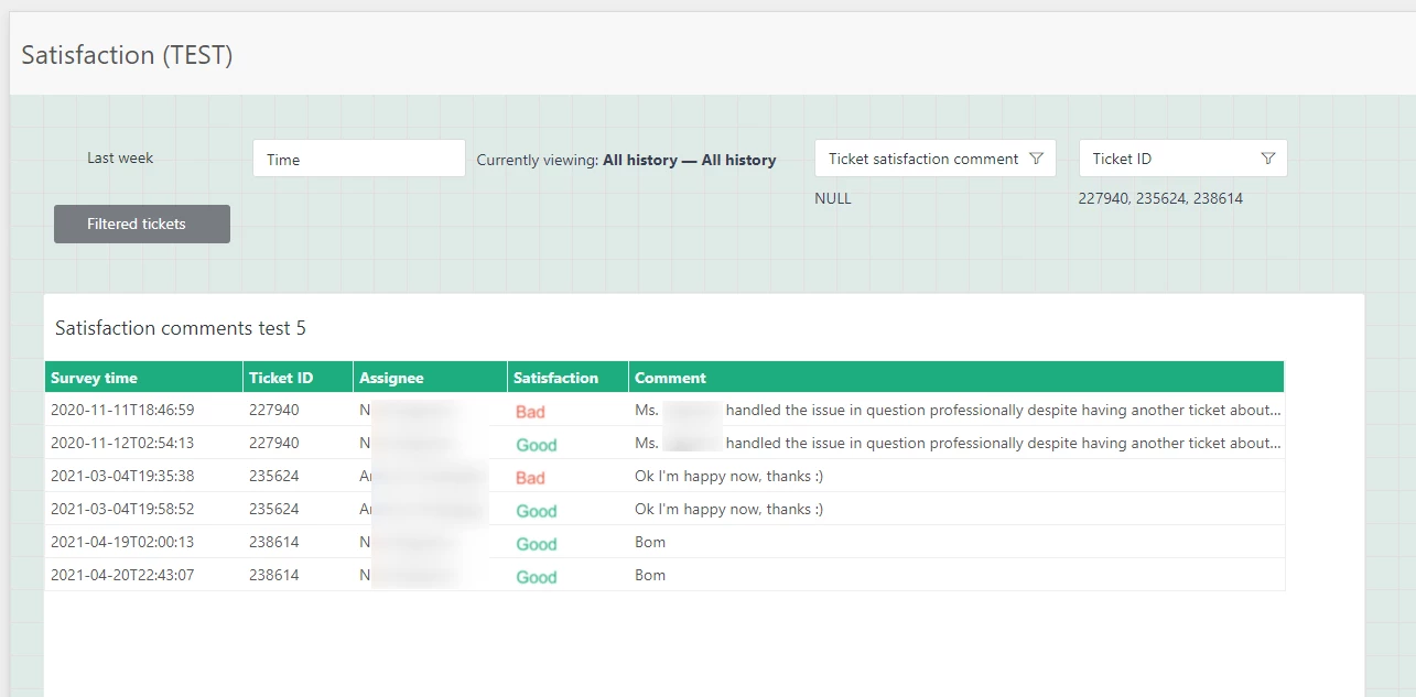 HOWEVER, there is a major flaw: all the rows show the “current” or “last” version of the satisfaction comment. Here is what it looks like, filtered to show only some example tickets: