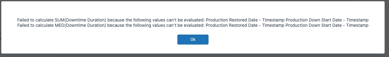 I am trying to calculate the “Downtime Duration” in days by subtracting one from the other using this formula: DATE_DIFF([Production Restored Date - Timestamp], [Production Down Start Date - Timestamp], "days")