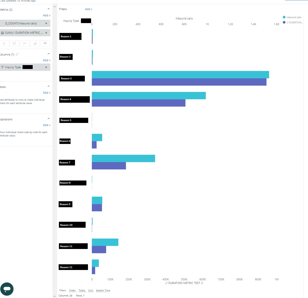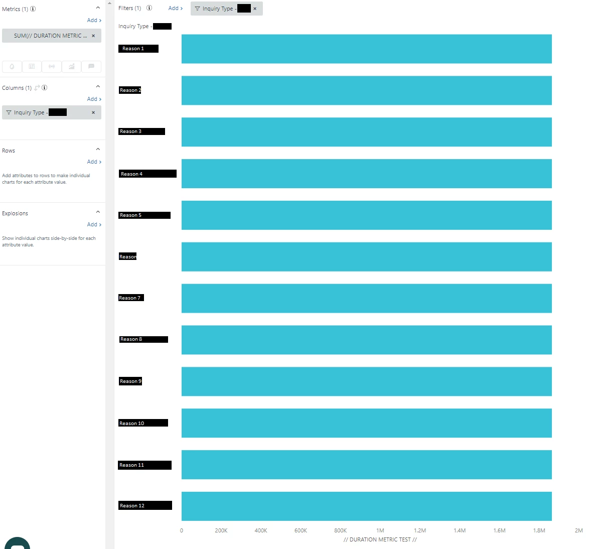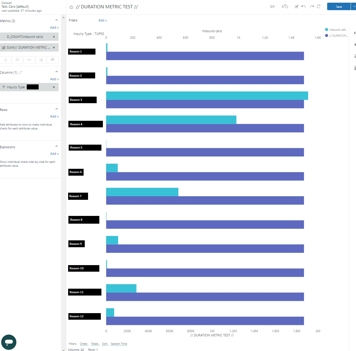 When calculating the total number of calls for each call reason, I can see a chart with each call reason showing the total number of calls for that reason as a bar next to it. However, when I change the metric from SUM of D_Count([Inbound Calls]) to my custom metric (SUM of INTEGER([Call Duration]), instead of showing the total duration by reason, it shows the total duration for all reasons next to each reason.