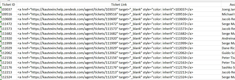 I needed to generate reports for multiple customers containing a list of open tickets and export it to Excel to share with them. Such a list needs to have a ticket number (ID) field, but also a link to the ticket so that the customer can open it in our help center by clicking on the link.