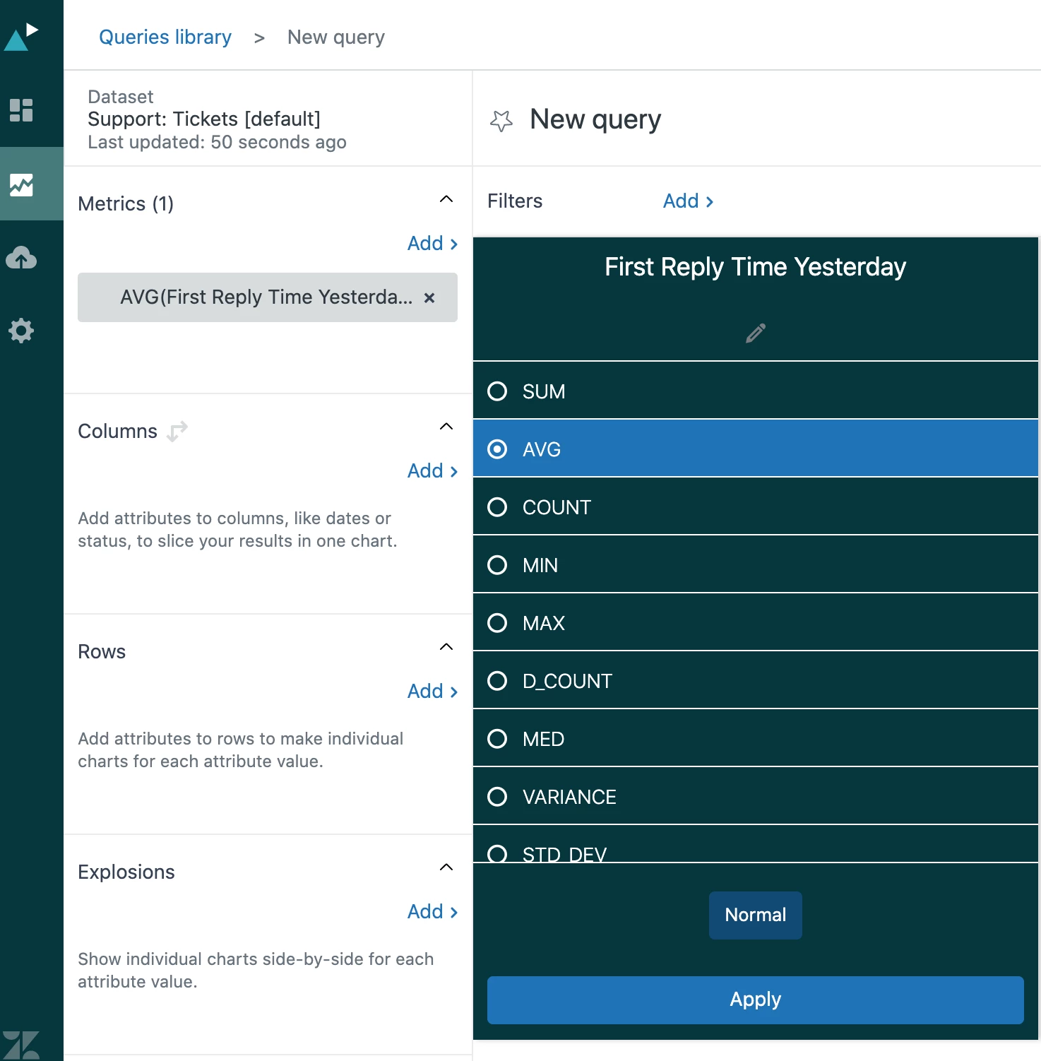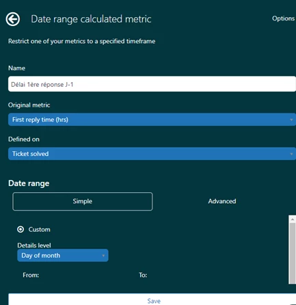 The first one is a date range calculated metrics wich give me the first reply time for yesterday :