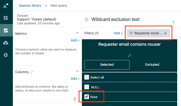 I have a simple query that pulls orgs and requesters, but I want to exclude the "nouser" requesters. I can filter the field by paging through ALL the nouser(s) and selecting them, but it would be so much easier to use some kind of wildcard.
