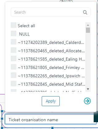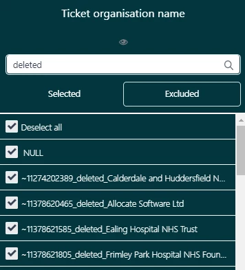 I have Excluded all deleted Ticket Organisation Name's them from a Query;