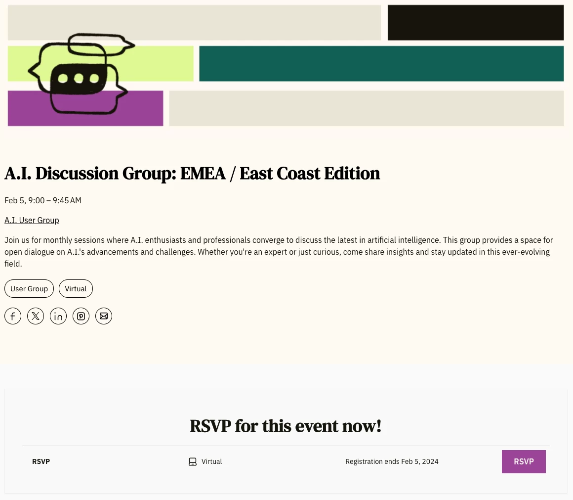 We're excited to announce this month's A.I. User Group Meetup for the EMEA and East Coast community! This group is dedicated to fostering a vibrant community where ideas and knowledge about artificial intelligence can be shared openly. Whether you're deeply embedded in the field or simply have a budding interest, we welcome you to join our conversation.