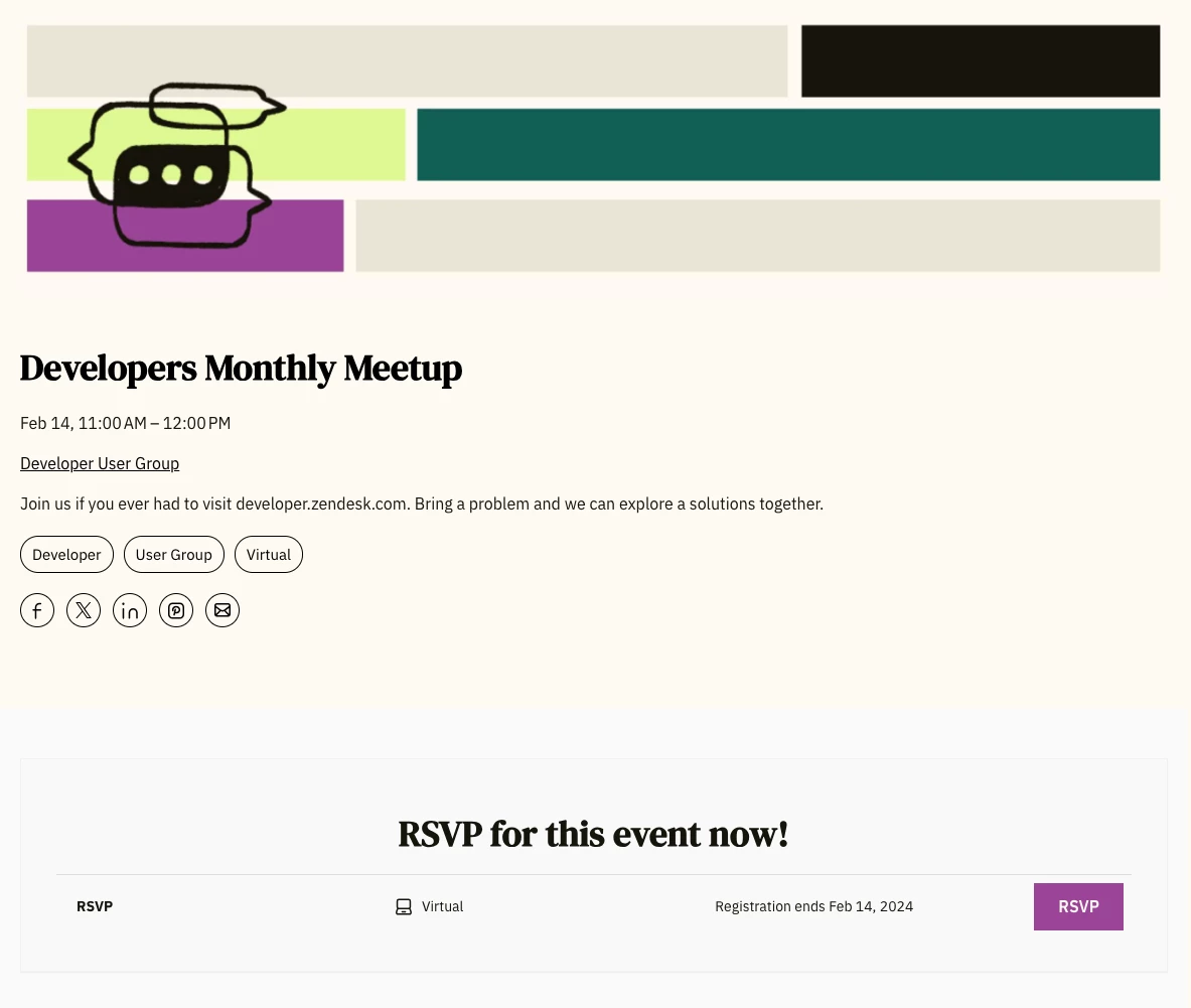 Mark your calendar for an exciting virtual gathering of the Developer User Group! Whether you're a veteran or new to the Zendesk development community, we're calling on you to join the meetup this Valentine's Day.