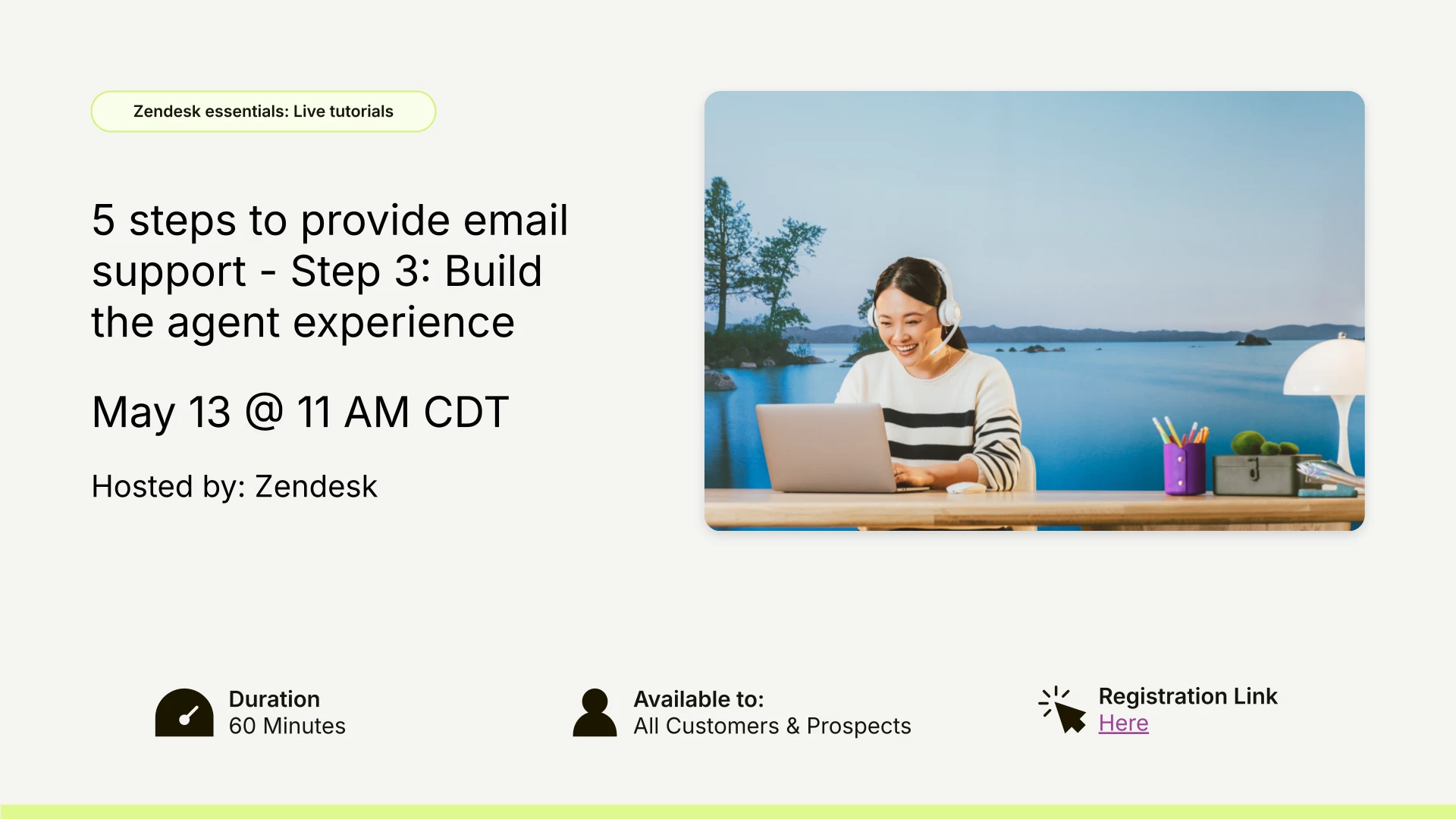 Next Tuesday, May 13 at 11:00 AM CDT, the Zendesk CX team will be hosting the third episode in our "5 Steps to Provide Email Support" series, called Step 3: Build the Agent Experience.