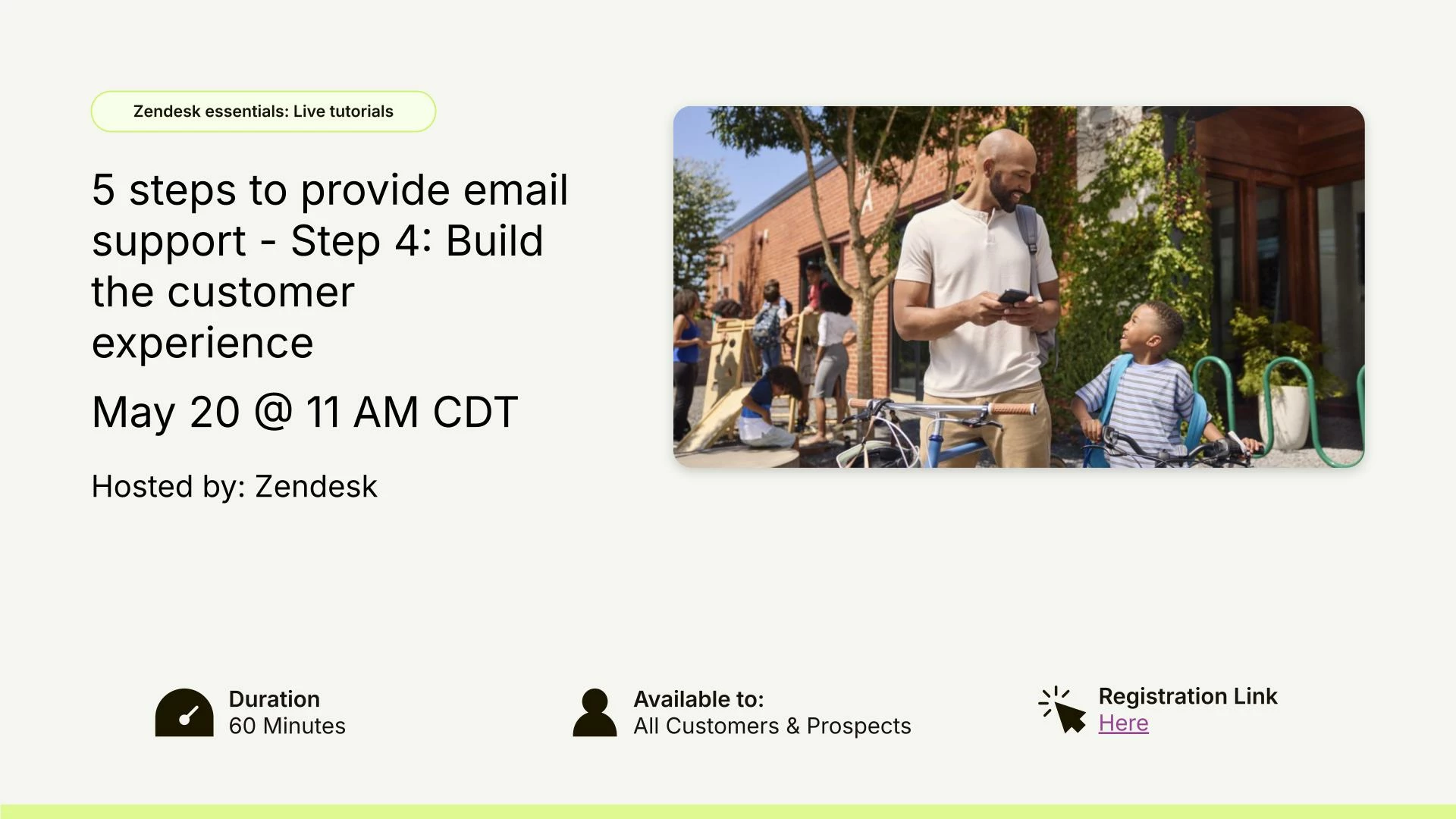 Next Tuesday, May 20, 2025, at 11:00 AM (CST), join us for the fourth episode in the “5 steps to provide email support” series titled, “Step 4: Build the customer experience.” In this session, we will focus on customizing email templates and understanding how emails are sent from Zendesk. You will learn how to set up notification triggers, manage customer feedback emails, provide a professional email address, and forward emails from employee addresses.