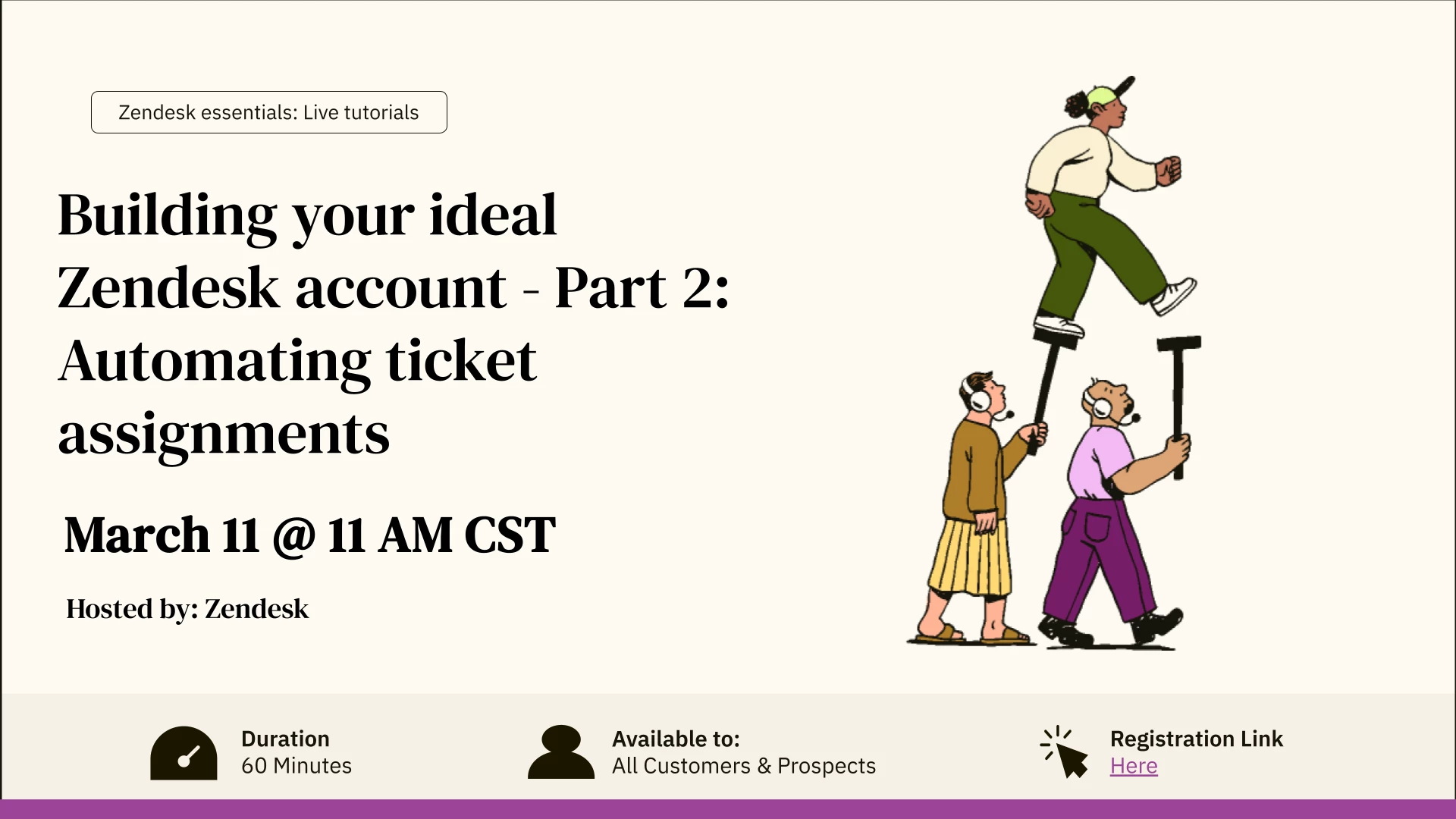 The Zendesk team is excited to announce the second episode of the Zendesk essentials: Live tutorials this time about Building your ideal Zendesk account - Part 2: Automating ticket assignments happening on March 11th, 2025 at 11:00 AM CST (UTC-06). This webinar will resume the work on building the ideal Zendesk account but this time looking at how to configure automatic ticket assignments to enhance your team’s efficiency and response times.