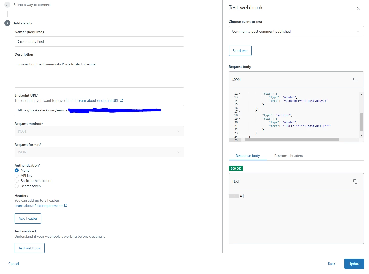 Thank you for reaching out and sharing the detailed steps you've taken to set up a Slack webhook for community post events.